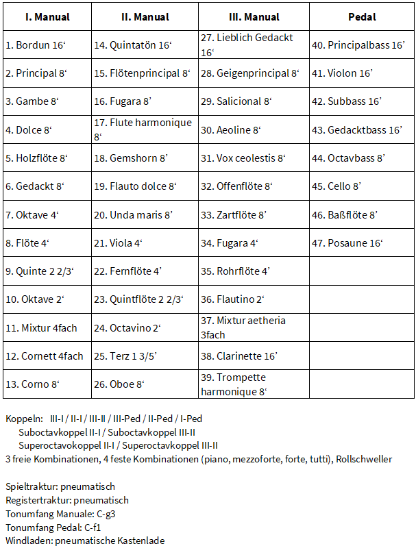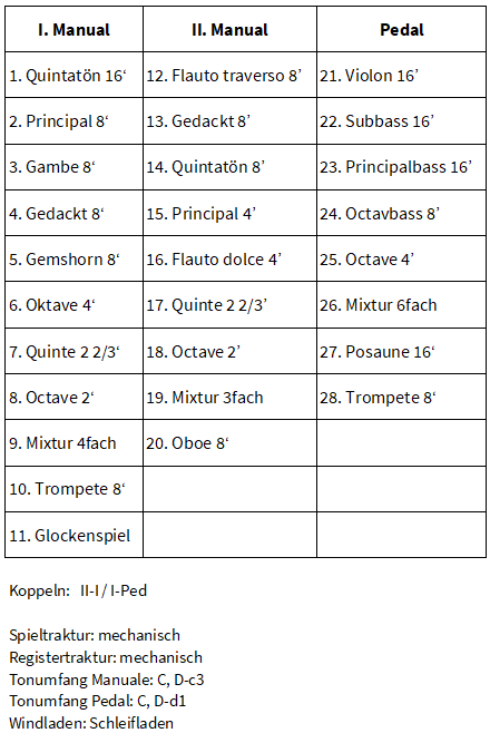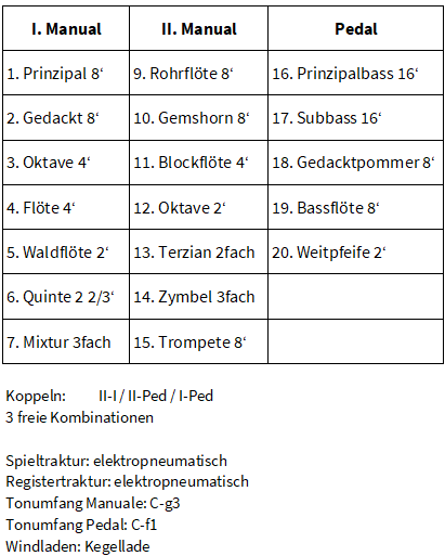 | 1. Prinzipal 8‘ | 9. Rohrflöte 8‘ | 16. Prinzipalbass 16‘ |